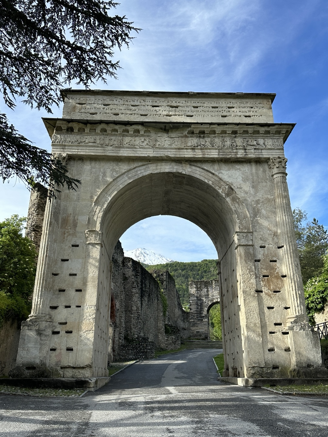 생각보다 사이즈는 아담했는데 굳이 표현하자면 고상하다. 화려하지 않고 간결한 아치가 단정하게 서서 우리를 맞았다. 초대 황제 아우구스투스의 개선문은 총 4개뿐인데 그중 하나다. 아우구스투스가 알프스를 넘어 영토를 확장하면서 이 지역 부족들과 평화협정을 맺고 기념으로 세운 것이다.