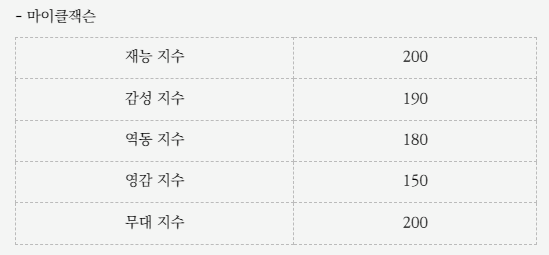 마이클잭슨은 재능지수 외에 무대지수도 200을 찍었다. 팬들이 실신해서 실려 나가는 정도의 무대를 보여준다면 200이란 수치가 나오는가 보다.