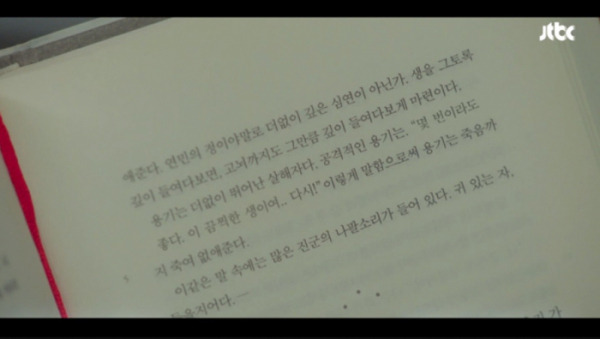 이 드라마가 주인과 노예의 관점에서 다뤄지고 있다는 건 여러 지점에서 확인할 수 있는데, 장대희와 오수아의 대사에서 뿐 아니라 후반부에 등장하는 책 한 권으로 여실히 드러난다. 조금은 뜬금없이 조이서가 책의 구절을 읽어주는 장면이 있는데, 그 책은 바로 니체의 『차라투스트라는 이렇게 말했다』이며 니체는 '주인도덕'과 '노예도덕'을 개념화하여 노예로서의 삶의 태도를 버리고 주인으로서의 삶을 살아갈 것을 강력하게 주창한 철학자이다. 그리고 선과 악이라는 도덕의 경계를 넘어 스스로 판단하고 선택하고 책임지는 주체로서의 정신을 피력했던 자다. 그런 그의 철학의 정수가 담겨있는 책이 바로 『차라투스트라는 이렇게 말했다』이다. 이 책이 등장하는 대목에서 필자는 이 드라마의 주제의식에 대한 심증을 확증으로 굳힐 수 있었고, 이 작품이 노예도덕을 버리고 스스로 주인이 되는 삶을 사는 이야기로서 구상되었다는 점을 확신할 수 있었다. 그리고 그런 삶이야 말로 끊임없이 분투해야 하는 삶이며 그런 분투를 통해서 비로소 영위될 수 있다는 걸 이 드라마는 말하고 있다. (사실 이 책이 등장하는 장면은 이야기 흐름과 전혀 상관없는 전개라 의도적으로 주제를 위해 삽입되었다는 걸 알 수 있으며, 특정 문장을 굳이 읽어주는 데서 다시 한번 그 의도를 확인할 수 있다.)