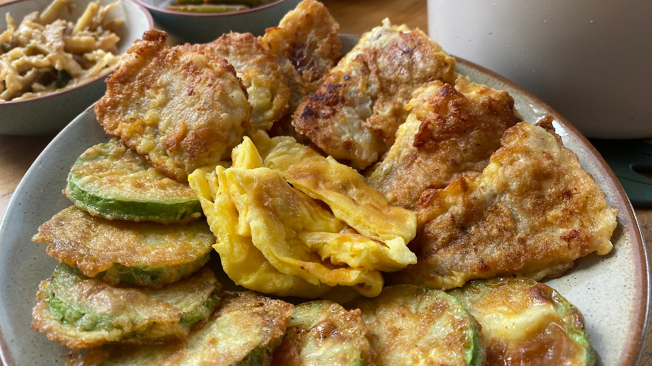 제사 음식이다, 가족 간 모임이다 해서 이래저래 할 게 많고 탈도 많고 말도 많은 한국사회의 명절 풍경이지만, 막상 제주에 떨어져 나와 살다 보니 그것도 그리운 풍경이 된다. 그렇게 지겹던 전과 갈비도 명절이 되면 생각이 나는 것이다. 전 붙일 때의 기름 냄새란 고된 노동의 향기로 각인되어 있지만 그 마저도 생각난다. 그래서 누가 시키지도 않았는데 명절에는 전을 부친다. 물론 제사 지낼 때처럼 각종 전들을 종류별로 만들지는 않지만, 그래도 꼭 빼놓지 않는 건 역시 호박전과 동태전. 전을 부쳐본 사람이라면 알 것이다. 노릇하게 익은 전을 뜨거울 때 간장도 안 찍고 입에 넣었을 때의 그 맛을. 호박은 달달하고 생선은 포슬포슬 녹아내린다. 기름의 고소함과 따뜻함이 만나 재료의 맛이 최상으로 상승한다. 그래서 갓 부친 전의 그 달콤함을 잊지 못해 오픈 준비에 바쁜 아침 시간을 쪼개 굳이 전을 부쳐 먹는다. 바쁘니까 호박전과 동태전 두 종류만. (어쩌다 여유가 되면 동그랑땡도 만들지만 역시나 동그랑땡은 손과 시간이 많이 가므로 웬만하면 패스) 양이 적은 나로서는 밥과 함께 먹으면 그것만으로도 충분하다. 찌개나 국을 곁들이면 더더욱 좋겠지.