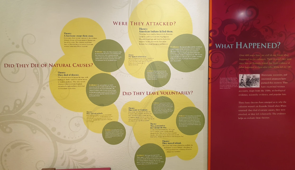 그가 돌아왔을 때, 마을에는 사람의 흔적을 찾을 수 없었고, 집들은 관리가 되지 않은 채로 허물어져 있었다. 울타리 말뚝과 나무 기둥에는 ‘‘CRO’, ‘CROATOAN’이라는 글씨가 새겨져 있었는데, 크로아토안(croatoan)은 로아노크섬 동남쪽에 위치한 섬으로, 영국을 다녀온 적이 있는 원주민 Manteo의 부족이 살고 있는 곳이었다.