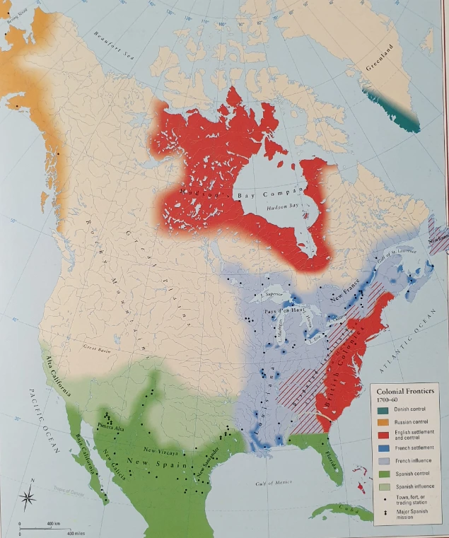 1700년대 중반의 북미 식민지 지도. 붉은 색이 영국, 푸른색이 프랑스, 초록색이 스페인의 식민지를 나타낸다. 짙은 색은 정착지, 옅은 색은 영향권을 의미