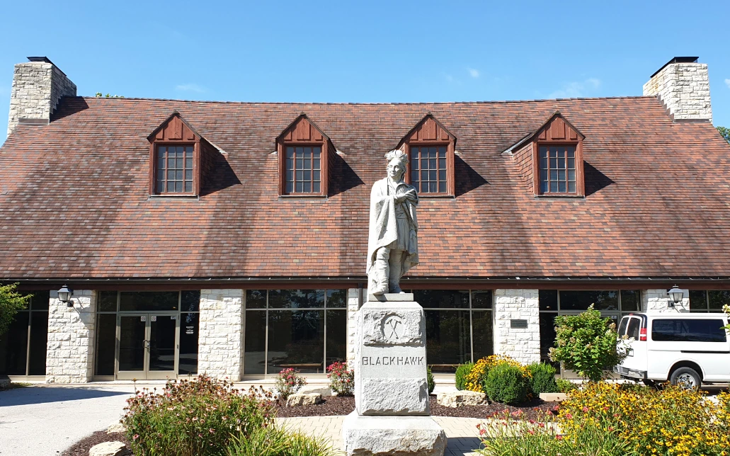블랙호크 뮤지엄은 일리노이주 서쪽 끝 미시시피강변의 록아일랜드(Rock Island)라는 곳에 위치해 있다. 마을로 들어서면 블랙호크란 이름이 여러 곳에서 보이기 시작한다. 블랙호크 주립사적지(Black Hawk State Historic Site) 안내판을 따라 뮤지엄을 찾아 가다가 잠시 길을 헤맸다. Watch Tower Lodge라는 간판 밑에 조그맣게 John Hauberg Indian Museum이라고 적혀있어 혹시나 하고 주차장으로 들어가보니, 입구에 블랙호크 추장 동상이 서있다.