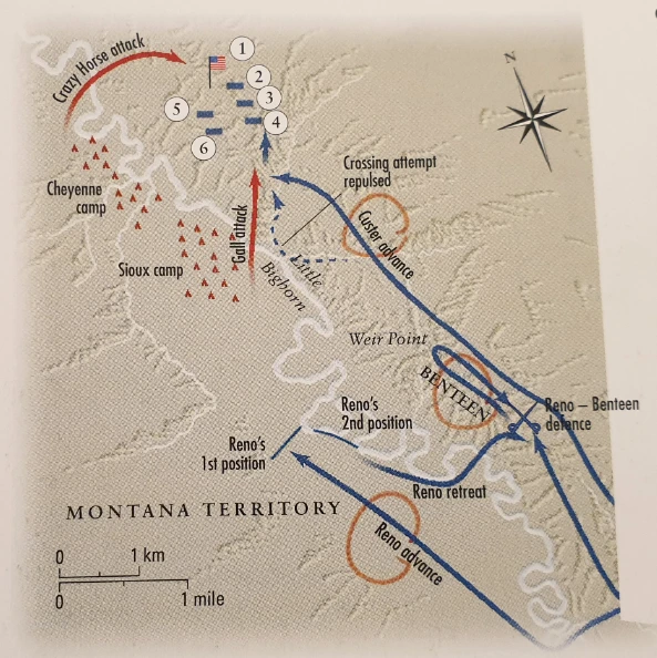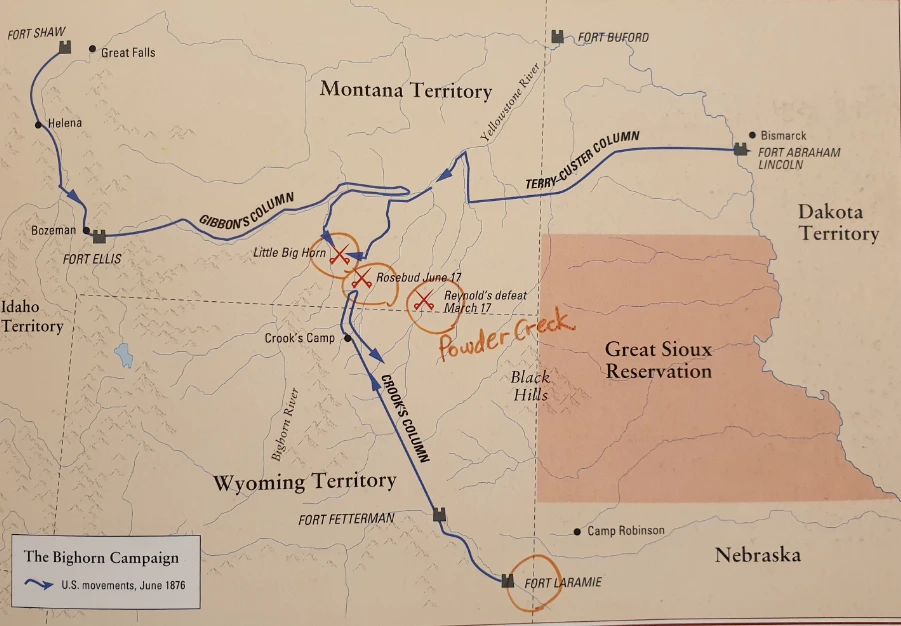 몬태나 지역의 인디언들을 토벌하기 위한 크룩 장군의 부대는 세 개의 축으로 나뉘어 진출했다. 남쪽으로부터는 크룩 장군이 직접 본대를 이끌고 진격했고, 테리(Terry) 장군과 커스터는 동쪽에서, 깁슨(Gibson) 대령은 서쪽에서 리틀빅혼 인근에 있을 인디언 부족들을 찾아 나섰다. 이 작전이 성공하기 위해서는 세 축으로 진행하는 부대간의 원활한 협조가 필수적인데, 당시 이들 부대는 서로 너무 멀리 떨어져 있어 상호교신이 쉽지 않았다.