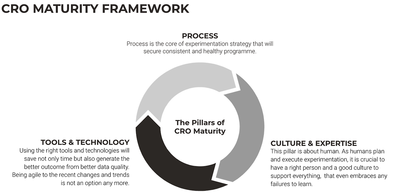그래서 회사에 제안 후 기존의 Digital Maturit Framework를 강화해서, 아래의 CRO를 위한 framework를 만들었다. 이 framework는 후에 글로벌 은행 A, 글로벌 음원 스트리밍 서비스 B 등의 CRO 프로젝트의 세일즈와 실제 CRO strategy에 활용되고 있으니, 이 프로젝트를 리드한 사람으로서는 꽤 보람을 느끼는 대목.