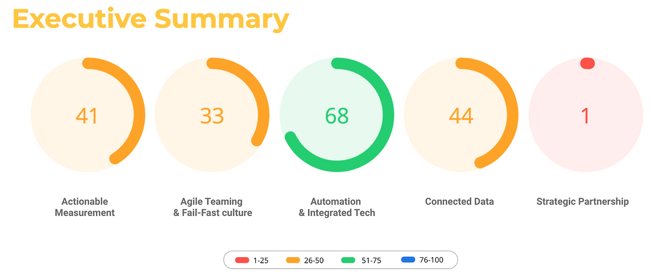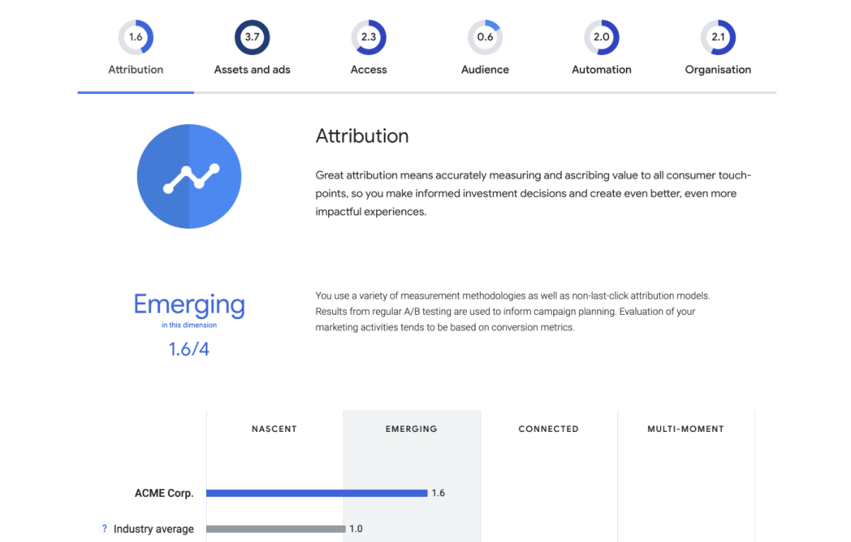 일단 알아둘 것은 이 평가가 디지털 마케팅에 굉장히 집중되어 있다는 점이다. 따라서 assessment dimension이 본래 BCG와 Google이 진행한 것과는 조금 차이가 있다. 마케터들의 이해를 돕기 위해 Attribution, Assets and ads, Access, Audience, Automation, organization의 6가지 dimension으로 조금 더 범위를 좁혔다. 그리고 각 dimension에 대한 평가와 benchmark를 제공해 조금 더 자신들의 위치를 파악하는 데 용이하도록 했다.