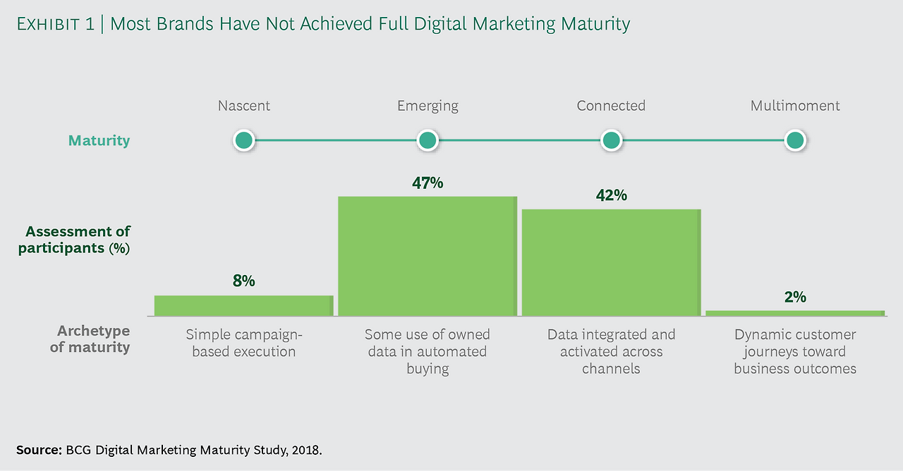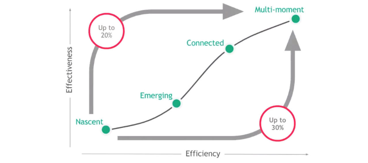 그 결과 회사들의 digital maturity를 4단계로 나눌 수 있었고 추가로 200개의 브랜드를 설문한 결과 top maturity에 해당하는 multi-moment에 해당하는 회사는 전체의 2%에 불과한 것을 파악할 수 있었다.