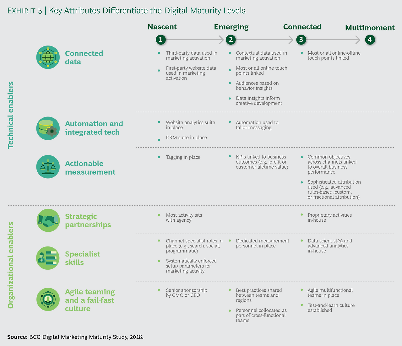 약 90%에 해당하는 회사들이 중간 단계에 해당하는 Emerging이나 Connected에 해당되는 것은 고무적이다. 하지만 다음 단계에서 요구되는 역량들이 더 까다로워지는 것을 본다면, 생각보다 다음 단계로 올라서는 일이 쉽지 않음을 알 수 있다.