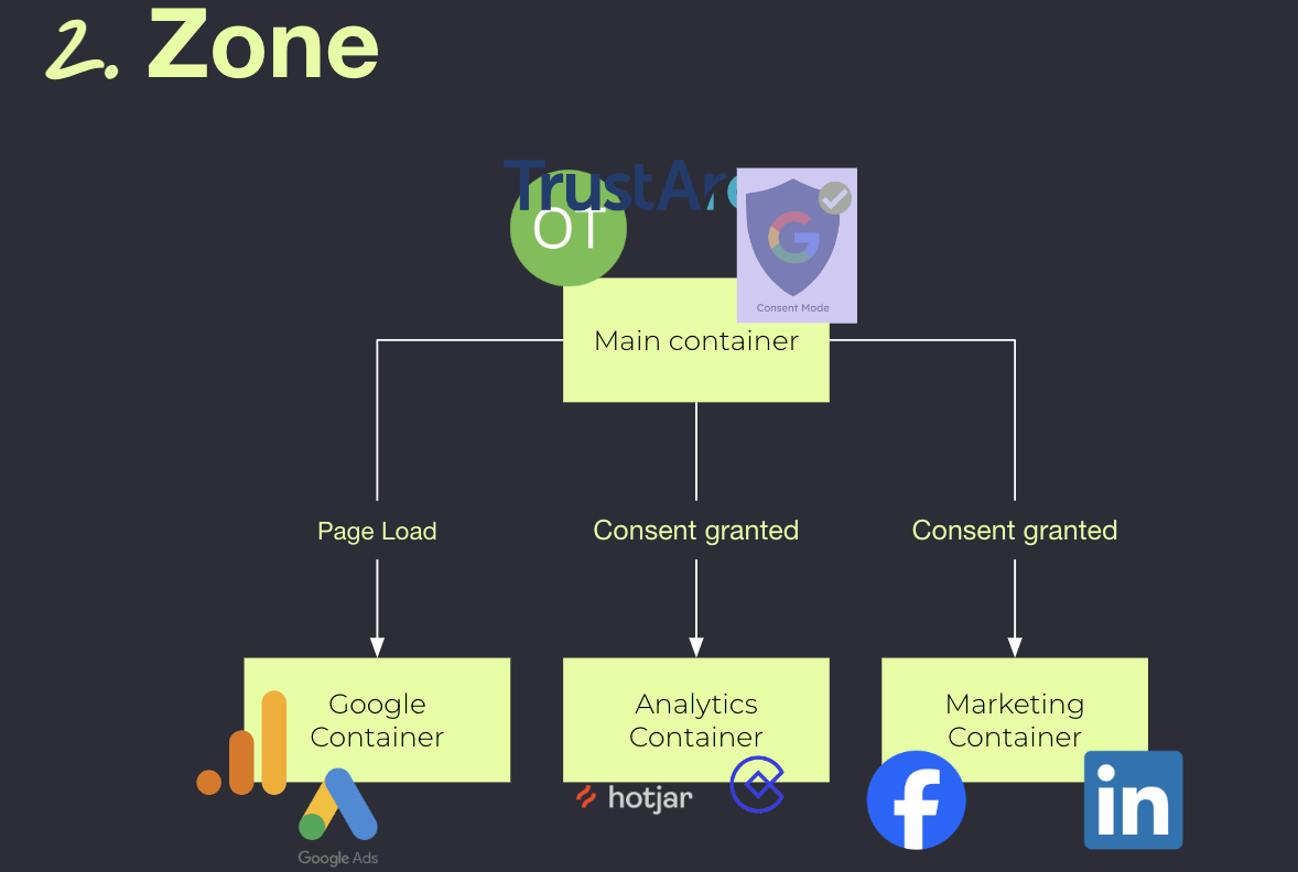 흥미로운 점은 Main container와 Zone들 사이에 약간의 시간 차이가 있다는 것이다. 쉽게 말해, Zone이라 하더라도 Main container 관점에서는 실행해야 하는 하나의 script 또는 tag에 불과하다. Main container의 gtm.js event와 Zone의 gtm.js event 사이에는 분명한 sequence가 존재한다. 따라서 Main container에 Custom HTML을 통해 Consent Mode를 컨트롤하고, 별개의 Zone을 통해 Google tag들을 컨트롤한다면, Zone의 Google tag들은 같은 page load라 하더라도 무조건 Consent Mode 보다는 늦게 실행된다.