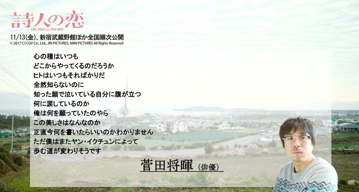 스다에 관한 또 하나의 이야기라면, 그와 3년 전 함께 '아, 황야'를 찍었던 양익준의 또 다른 영화 '시인의 사랑'이 다음 달 도쿄에서 개봉한다. 그러고보면 오래 전 대부분의 외화들은 시차를 갖고 국내에 도착했고, 오랜 시절 '금지' 딱지가 붙어있던 일본 영화는 더욱더 긴 세월의 차이를 두고 찾아왔는데, 세월의 두께는 어느새 그 '차이'를 무디게 하고, 영화에 대한 애탄 마음도 그만큼 희미해졌다. 하지만 무슨 우연인지 '시인의 사랑'은 양익준의 '아, 황야'가 공개되던 그 해 가을에 개봉한 영화다. 어쩌면 조금 늦은 2017년의 나머지 한 자락이 지금 도쿄에 도착하고 있는 듯한, 이 시절이기에 가능한 착각이 스쳐간다. 나는 이 영화의 시사회장에서 양익준 감독과 잠시 마주쳐 짦은 인사를 나눈 기억이 있고, 개봉 전 미리 공개된 '시인의 사랑'에 대한 일본 내 반응은 호평 일색이다. '이 영화가 재밌는 이유는, 주인공 시인의 감정을 알기 쉽게 말로서 치환하지 않는다는 것. 말이란 얼마나 임기응변적인가. 제주도의 아름답고 공포스런 풍경에 처음 보는 듯한 기분이 솟아난다. 어디에도 없는 호화로운 경험.'(오오모리 타츠시 감독), '양익준 씨가 갖고있는 부드러움과 아름다운 감수성, 기존의 가치를 훌쩍 뛰어넘는 부드러운 인간성을, 이만큼 생생하게 살려낸 작품은 어디서도 보지 못했습니다.'(니시카와 미와 감독).