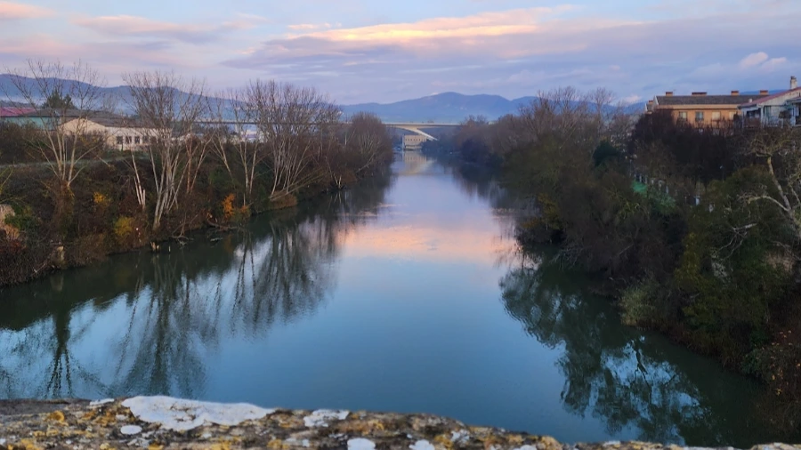 푸엔테 라 레이나를 흐르는 아르가 강은 석양이 드리운 연홍빛 물결 위로 푸른 하늘이 비쳐 황홀한 색채를 빚어냅니다. 강가에 늘어선 건물들은 붉은 기와와 돌담이 어우러져 고풍스럽고 몽환적 분위기를 자아냈습니다.