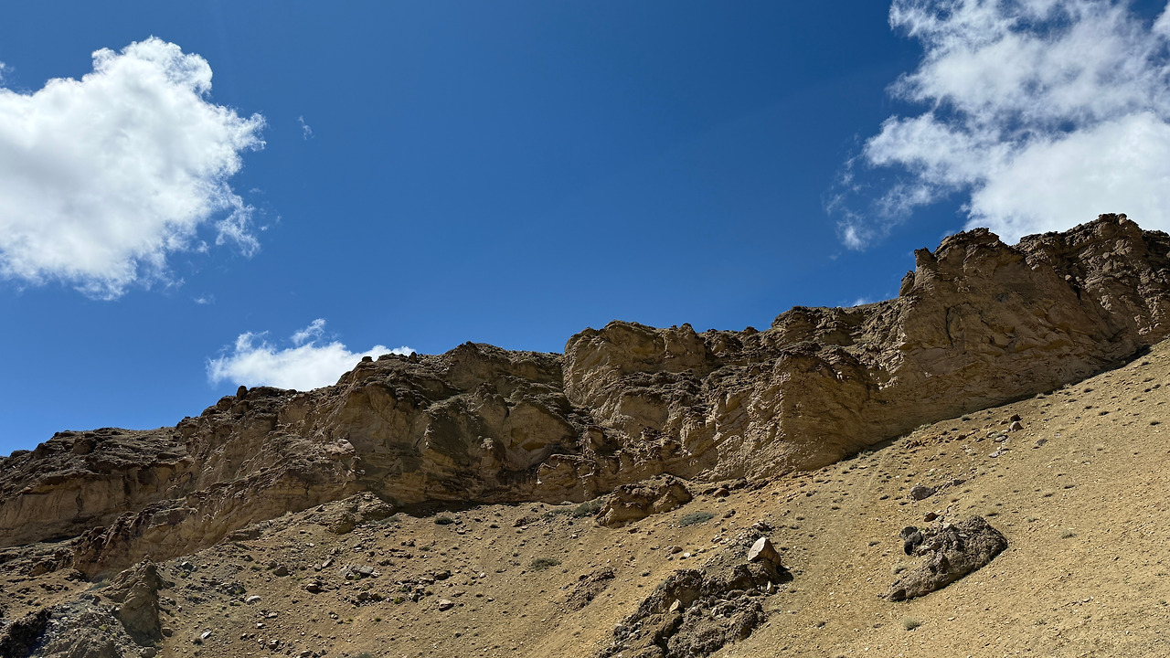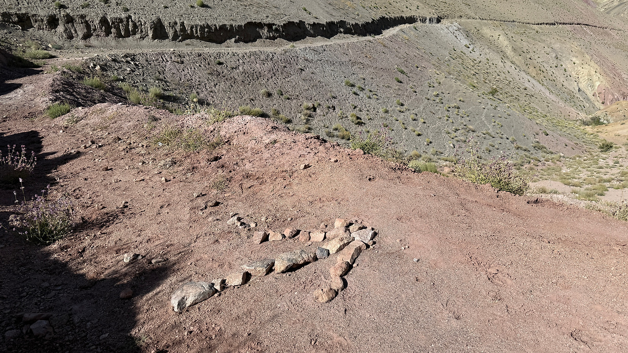 마을을 나서자 흙과 자갈이 뒤섞인 사면 언덕이 펼쳐졌습니다. 붉은 흙과 회색 바위가 켜켜이 쌓인 지층과 그 위로 드문드문 돋아난 초록빛 풀들.