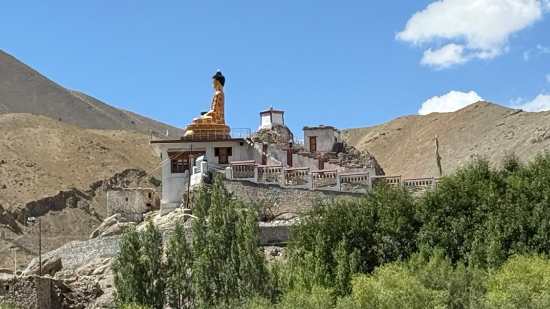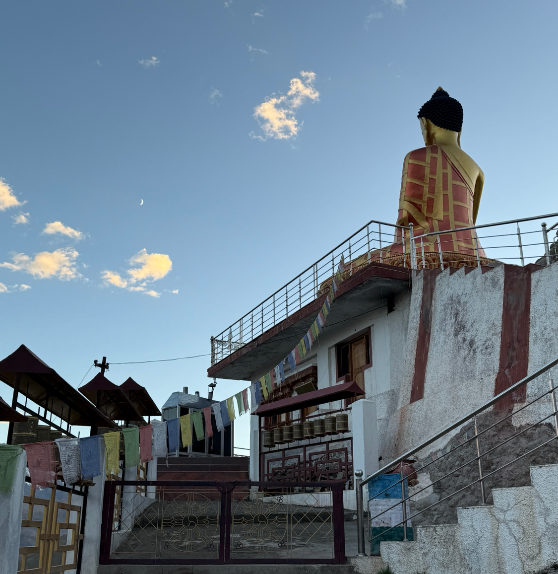불상은 언덕 꼭대기에 설산을 배경으로 고요하게 서 있습니다. 상쾌한 바람이 불고 발아래로는 마을 전체가 한눈에 내려다보였습니다. 불상 앞에 앉아 그 풍경을 바라보는 순간이 얼마나 평화로웠는지 모릅니다.