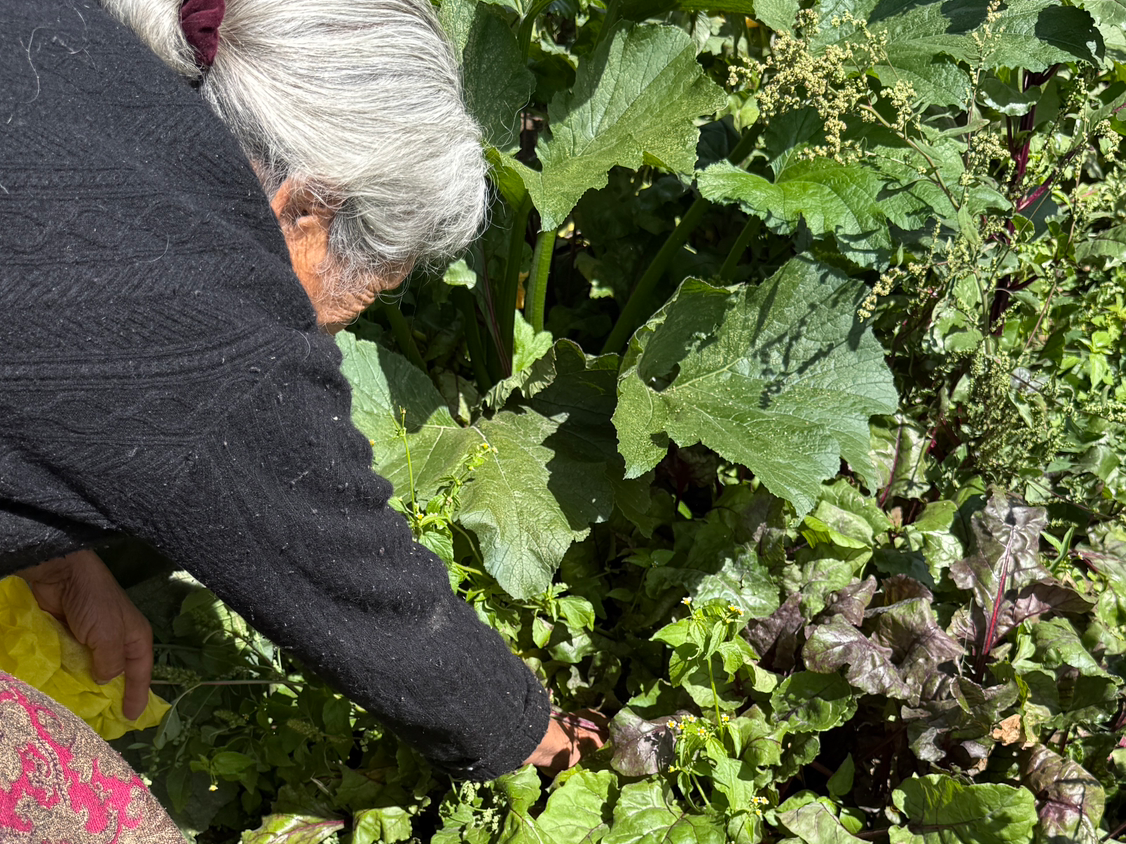 할머니를 따라 집으로 향했습니다. 가는 길목마다 할머니는 걸음을 멈추고 땅에 웅크려 앉아 야채를 캐내셨습니다. 이 외딴 협곡의 척박한 환경에서도 채소를 기르고 자급하며 살아가는 모습이 신기했습니다.