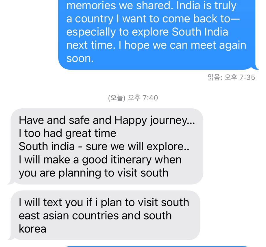 이스라엘 여행자들만의 문화를 직접 볼 수 있는 기회였을텐데, 지금 돌이켜보니 조금 아쉬움이 남습니다. 한편 크리슈나는 제가 떠나는 마지막 날 바이크 여행을 가 있어 만나지 못했지만, 문자로 작별을 나누며 언젠가 남인도를 방문하겠단 약속을 전했습니다.