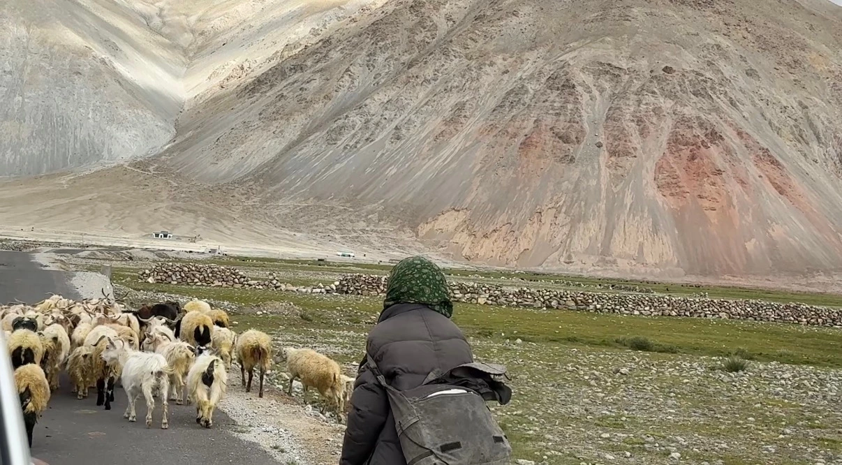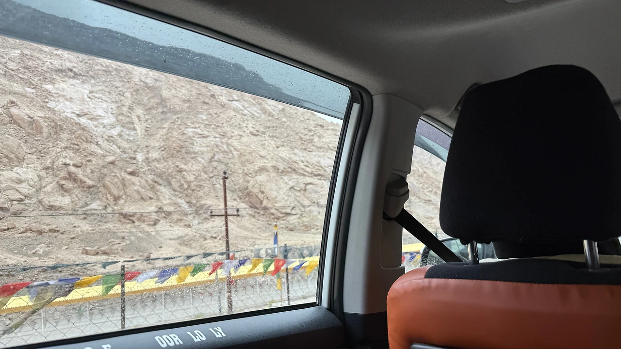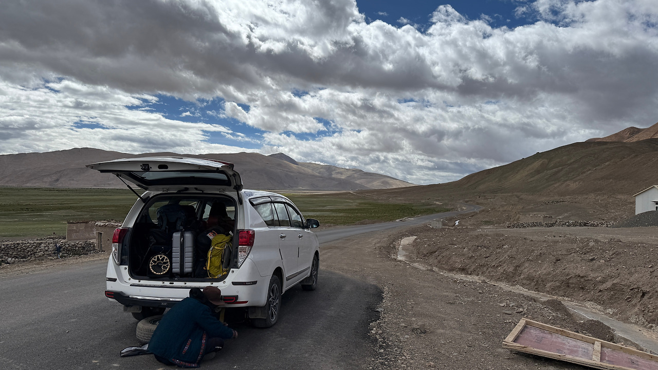 라다크의 길은 포장되지 않은 험준한 도로가 많습니다. 한레로 향하던 중 차가 서서히 멈추더니 타이어가 터져버렸습니다. 다행히 예비 타이어가 있어 교체한 뒤 무사히 길을 이어갈 수 있었습니다.