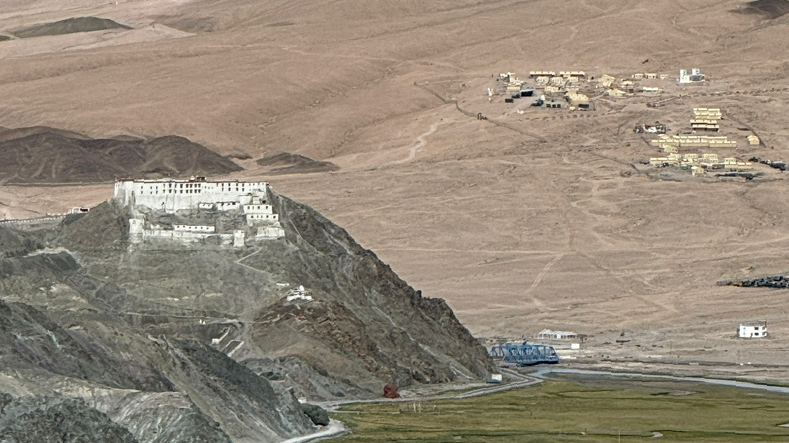 광활한 창탕 고원, 모래 언덕, 설산이 어우러진 건조한 대지 위에 흰 벽의 한레 곰파가 언덕 위에 서 있고, 그 아래로 흙집 몇 채와 초록 목초지가 펼쳐졌습니다.