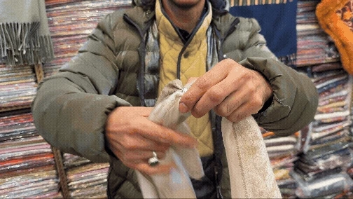 파슈미나는 고지대에 사는 티베트 영양의 겨울 솜털로 세계에서 가장 고급스럽고 희소한 섬유 중 하나입니다. 진품 테스트를 부탁드렸고 어머니께 드릴 선물로 한 장 구매했습니다. 이역만리에서 구한 기념품입니다.