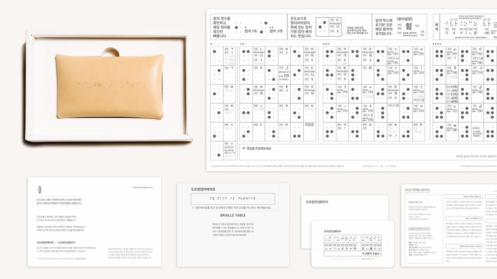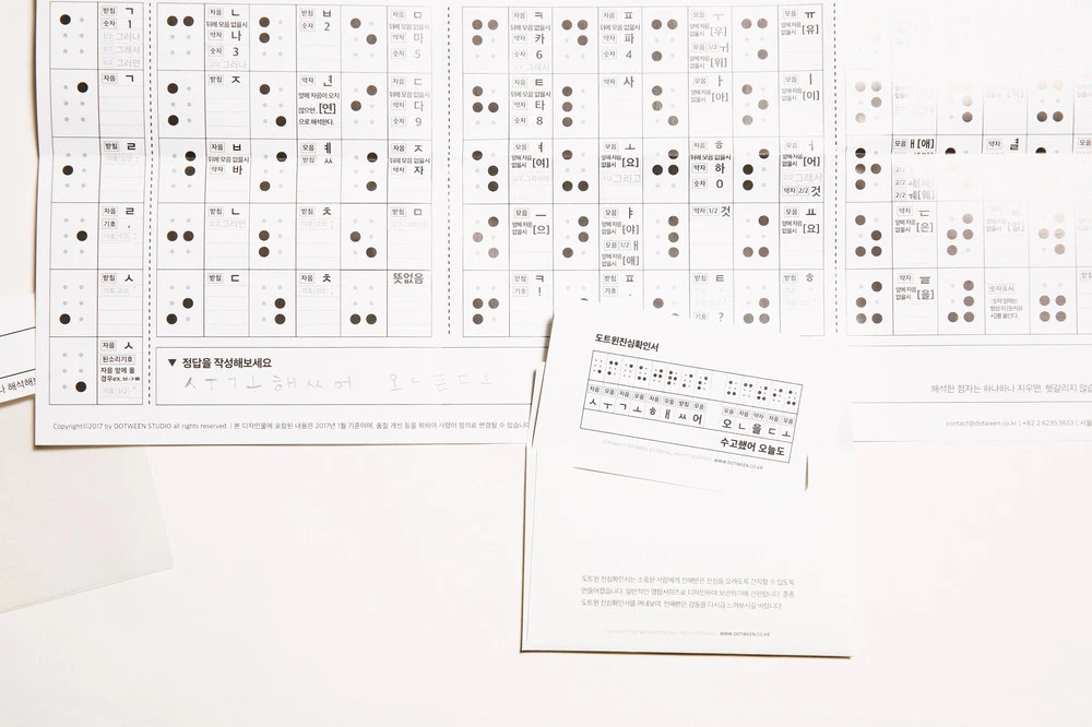 점자해석표를 보는 방식은 ‘점자의 갯수’에 기준했다. 사람들이 직관적으로 점자의 갯수를 확인해서 찾아나갈 수 있도록 유도한 것이다. 하나의 표로 완성된 점자해석표 한 장이면 국내에서 어떤 점자를 보더라도 그 뜻을 해석해볼 수 있었다. 점자해석표는 여섯 번 접어 우리의 제품 패키지에 함께 동봉되었고, 도트윈을 선물 받은 이는 패키지를 열어보면서 직관적으로 점자의 뜻을 해석해볼 수 있었다. 이것은 어렸을 적 펼쳐봤던 레고 설명서를 보는 경험과 유사했다. 종이 한 장에 담긴 점자해석표는 웹상에 구현된 프로그램보다 저렴했고, 이동이 용이했다. 또 받아보는 이들은 전보다 더 재밌고 편리하게 점자를 해석할 수 있었다. 이는 여러 방면에서 회사와 고객 둘 다에게 더 이득이 되는 방식이었다.