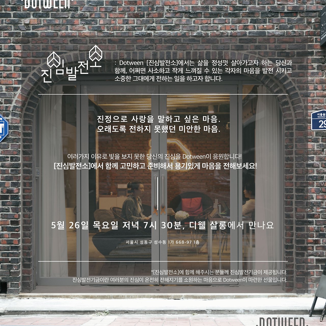 진심발전소는 매월 말 늦은 저녁, 디웰 살롱이라는 공간에서 진행되었던 소규모 모임이다. 전하지 못했던 진심을 가진 누구나 참여할 수 있으며, 매번 모임은 최대 7명을 넘지 않았다. 사전 신청을 하고, 진심발전소 당일날 살롱으로 오기만 하면 참여를 위한 준비는 끝. 참여자가 모두 모이면, 진심발전소에 대한 간단한 설명으로 모임이 시작된다. 각자가 마음에 두고 있는 진심에 대해서 한 사람 한 사람 털어놓는 것으로 모임이 진행된다. 고민을 공유하고, 듣고, 공감하고, 함께 고민하고. 그렇게 1시간가량의 대화가 끝나면, 각자가 이제 이 진심을 어떻게 전할 수 있을지를 함께 이야기하고 피드백한다. 이렇게 고민한 서로의 생각들은 각자가 돌아가서 실행하는 것을 약속하며 모임이 끝난다.