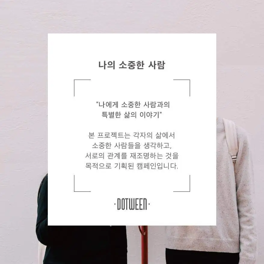 '나의 소중한 사람' 캠페인을 통해 이야기하고자 한 것은 단순히 캠페인에 참여하는 단 둘의 관계가 아니었다. 이야기를 읽으며 본인이 소중하게 생각하는 사람이 누구인지, 또 그들과 본인의 관계는 어떠한지를 다시금 생각해볼 수 있는 기회가 되기를 바랐다. '나의 소중한 사람' 캠페인은 사실 오래가지 못했다. 두 번째의 이야기를 마지막으로 우리는 캠페인을 끝내게 되었는데, 그 이후 게릴라성으로 길거리에서 만나는 사람에게 '나의 소중한 사람'에 대한 질문을 남기는 일명 '나소사 스트릿'을 진행하며 캠페인을 이어가기도 했었다. 프로젝트가 일찍 종료하게 되었던 것은 프로젝트를 진행하기 위해 들어가는 노력 대비 아웃풋이 부족했던 탓이었을까. 어쩌면 즉시 수익으로 이어지지 않았던 탓도 있었을 것이다. 그럼에도 나는 5년이 지나 도트윈을 폐업한 지금, 도트윈을 도트윈답게 했던 사업 중 하나로 '나의 소중한 사람'을 꼽는다.