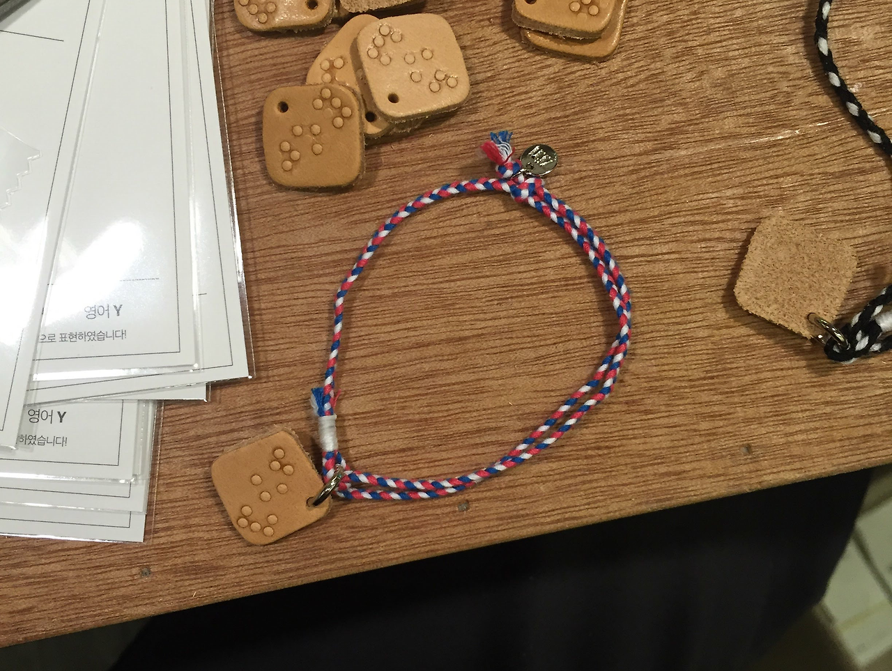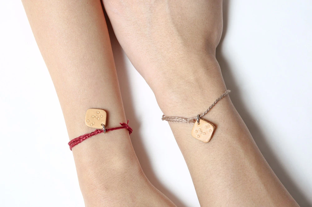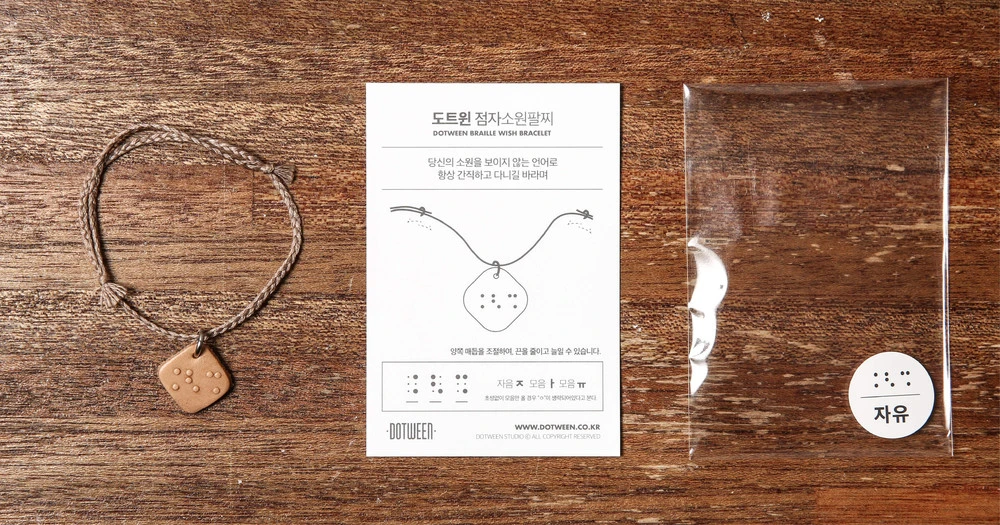 "소원팔찌 만들어만 주면, 내가 서울숲까지 가서 호객하면서 다 팔아올 수 있는데!"라고 말하는 애나의 말에 마치 우리에게 절대 일어나지 않을 일처럼 함께 키득키득 웃었다. 계속되는 회의로 지쳐있던 우리에게 소원팔찌의 아이디어는 간만의 웃음이었다. 나는 소원팔찌의 아이디어가 썩 내키지 않았지만, 애나와 재성의 반응은 나쁘지가 않았다. 우리는 보이지 않는 언어라는 점자의 특성을 잘 살린다면 꽤나 유의미한 제품이 될 수도 있을 것 같다며 의견을 좁혔고, 본격적으로 기획을 해보기로 했다. "이번 주말까지 만들어서 한번 판매해보고 반응을 보자"라며, 그 주의 주말이 오기 전에 소원팔찌를 제작해서 바로 판매를 해보기로 했다. 우리는 곧장 동대문으로 달려가 팔찌에 적합한 실을 사입했고, 가죽으로 펜던트를 디자인했다. 사람들이 일반적으로 염원하는 소원들을 3점, 4점의 점자로 변형했고, 이를 가죽 펜던트에 각인하여 도트윈의 점자소원팔찌를 완성했다.