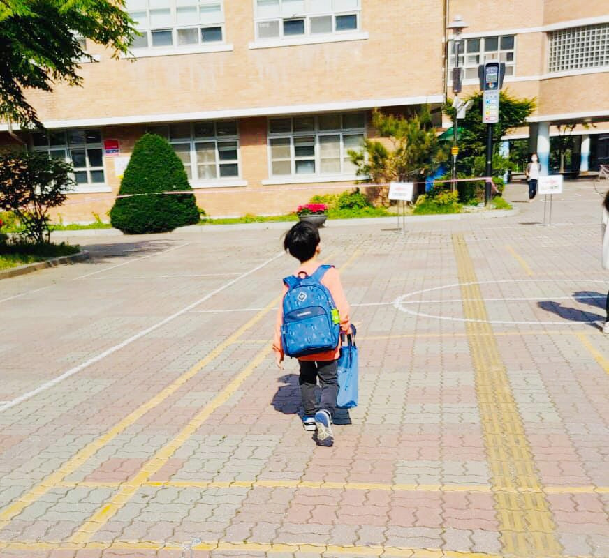 지난 5월 말, 제 아들 생애 첫 등교 현장입니다.
