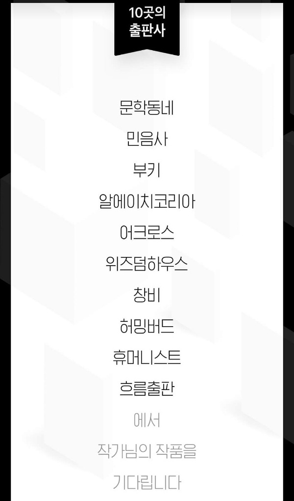 이번 공모전에는 10곳의 출판사가 참여했는데요. 문학동네, 민음사, 위즈덤하우스, 창비 등 이름만 들어도 쟁쟁합니다. ‘한 군데만이라도 선택해줬으면 좋겠다’라는 기대와 바람은 저뿐만 아니라 출품 작가 모두 하고 있겠지요.