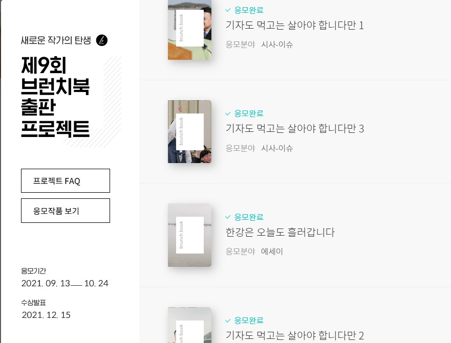 이번에 출품한 브런치북은 총 4권입니다. 기자 생활에 얽힌 이야기를 3권으로 나눈 ‘기자도 먹고는 살아야 합니다만’ 시리즈를 시사·이슈 분야에 냈고요. 한 권은 ‘한강은 오늘도 흘러갑니다’라는 에세이입니다. 모두 다 애정 어린 작품입니다.