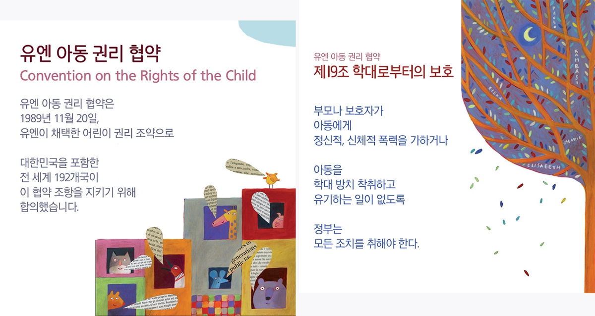 부모나 보호자가 아동에게 정신적, 신체적 폭력을 가하거나 아동을 학대 방치 착취하고 유기하는 일이 없도록 정부는 모든 조치를 취해야 한다. 유엔 아동권리협약 제19조 학대로부터의 보호