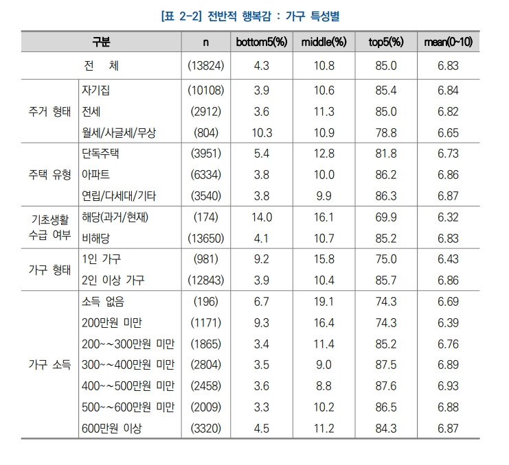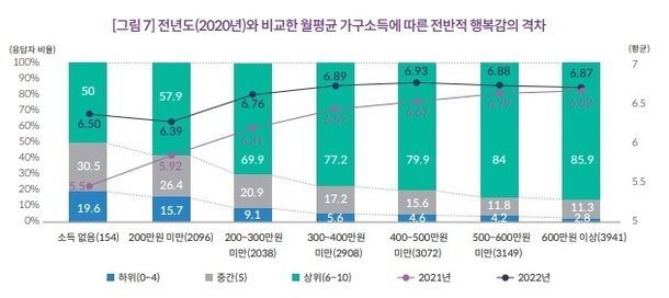 특히 사회적 취약 집단이나 계층의 행복 감소폭이 더 컸다. 예컨대 노인, 저학력층, 저소득층, 불안정 고용자, 1인 가구, 세입자, 기초수급자, 다문화 가정 등의 행복 수준이 낮은 것으로 나타났다. (중략) 소득 형태별로는 임금노동자가 자영업자보다, 고용 형태별로는 상용노동자가 임시 및 일용노동자보다 행복감이 높았다. 소득 수준별로는 가구 소득이 많아질수록 행복감이 높아지는 추세를 보이다가 월평균 소득 300만원 이상에서는 별다른 차이를 보이지 않았다. 한 해 전과 비교하면 소득이 적을수록 행복 감소 폭이 컸다.