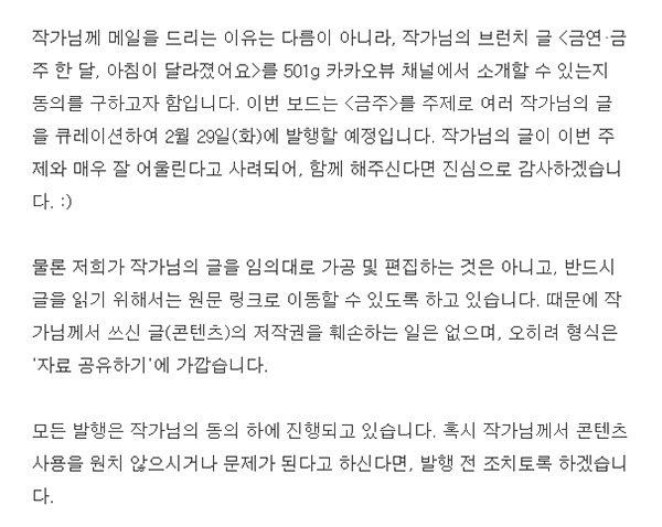 저희가 작가님의 글을 임의대로 가공 및 편집하는 것은 아니고, 반드시 글을 읽기 위해서는 원문 링크로 이동할 수 있도록 하고 있습니다. 때문에 작가님께서 쓰신 글(콘텐츠)의 저작권을 훼손하는 일은 없으며, 오히려 형식은 '자료 공유하기'에 가깝습니다. -501g 제안 글