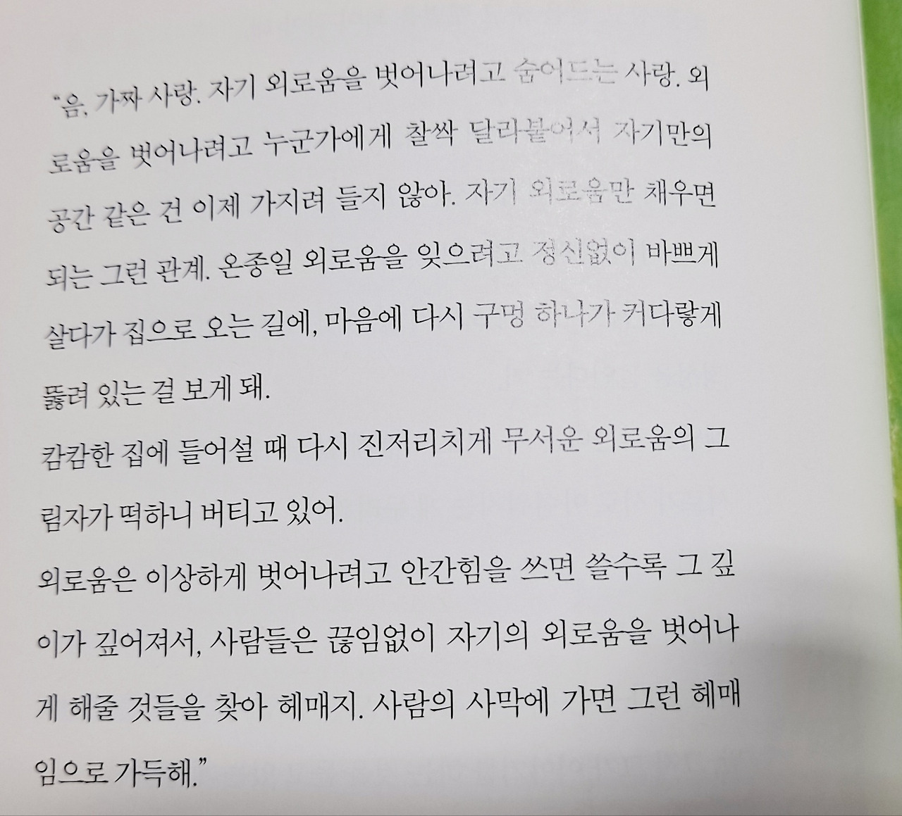 “외로움은 이상하게 벗어나려고 안간힘을 쓰면 쓸수록 그 깊이가 깊어져서, 사람들은 끊임없이 자기의 외로움을 벗어나게 해 줄 것들을 헤매지. 사람이 사막에 가면 그런 헤매임으로 가득해.” -<사막여우가 어린왕자에게>
