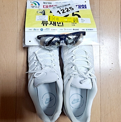 새 운동화와 선글라스와 배번호입니다.