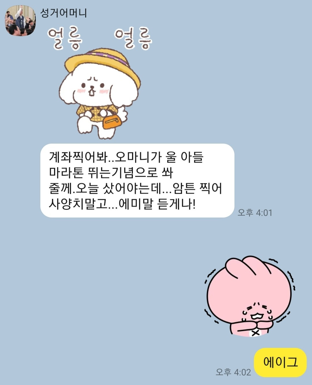 저도 대청 호반길을 달리면서 성거에 계신 어머니를 떠올릴 작정입니다. 어릴 적 못 보여드린 등수 손목 도장 대신, 완주 메달이라도 목에 걸어 드려야겠습니다.