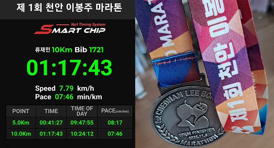 ‘제1회 천안 이봉주 마라톤대회’ 10km 완주에 성공했습니다. 며칠 전부터 무릎이 안 좋고, 감기까지 걸려 컨디션이 최악이었습니다. 완주를 할 수 있을지 걱정이 컸습니다.