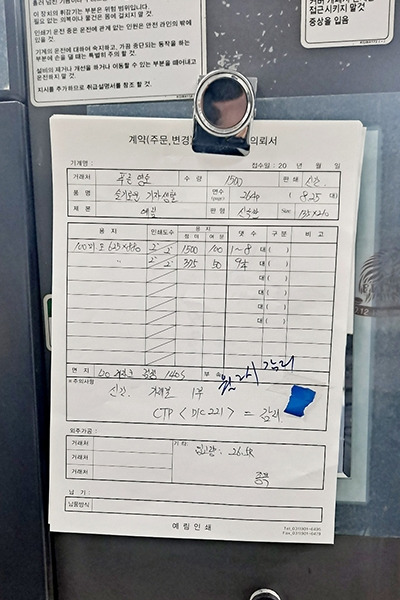 인쇄소 지하 작업장에 붙어 있는 제 책 주문서입니다.