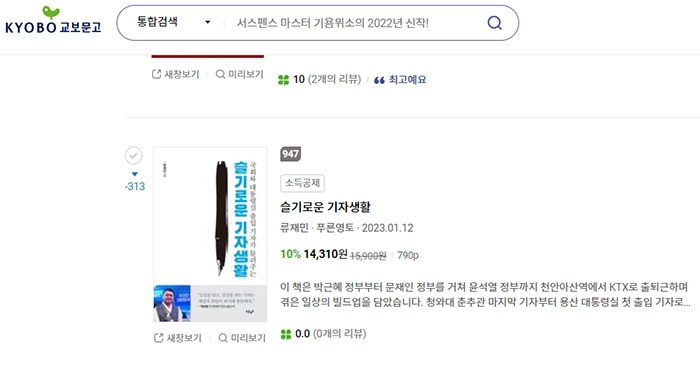 교보문고 시/에세이 947위. 지난 12일 출간한 ‘슬기로운 기자 생활’ 1월 마지막 주 순위다. 지난 17일 356위까지 치고 올라갔다가 설 명절 연휴를 기점으로 하락세가 두드러지고 있다. 인문/미디어 주간 10위권을 유지했던 알라딘은 12위까지 밀렸다. 예스24도 판매지수 1,000점대 유지가 버거울 정도다.