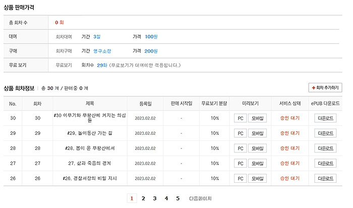 대여료(3일)는 회차당 100원으로, 구매는 200원으로 정했다. 가장 최소 금액이다. 에게? 그렇게 받아서 언제 돈 버냐고? 맞다. 그렇게 벌어서 어느 세월에 부자가 되겠나.