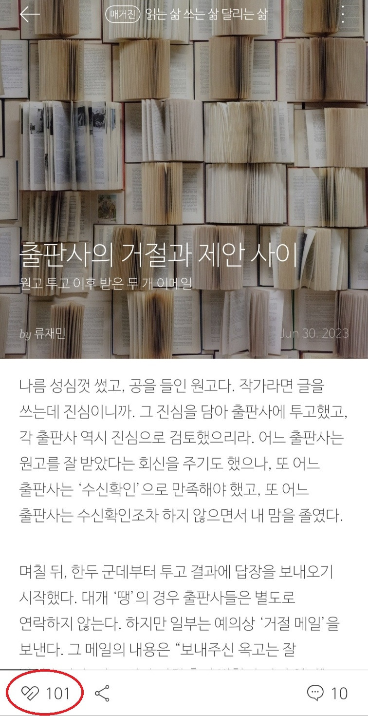 얼마 전, 투고한 원고가 채택되지 않아 퉁퉁거리며 쓴 글이 있다. ‘출판사 놈들’이라는 다소 과격한 표현까지 쓰면서 아쉬움을 토로했다. 하지만 어느 출판사의 정중하고 정성 어린 거절 메일에 감동과 감격했다. 그걸 글로 썼는데, 반응은 폭발적이었다. 4년여 쓴 브런치 글 가운데 가장 많은 라이킷(좋아요)을 받았기 때문이다.