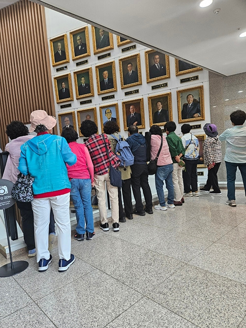 국회박물관에서 역대 의장 초상화를 보고 있는 학생들.다음으로 국회 본회의장으로 이동했다. 박물관에서 본 모형 회의장이 아닌, 진짜 회의장. 본회의장에 들어선 학생들은 ‘여기가 뉴스에서 맨날 치구박구하는 데여?’라고 물었다. 나는 그렇다고 고개를 끄덕였고, 할머니 할아버지 학생들은 마냥 신기한지 방청석에 앉아 여기저기 둘러봤다. 이윽고 국회 해설사가 국회 본회의장 곳곳을 설명했고, 안에서도 사진을 찍는 시간을 가졌다. 어딜 가나 마지막으로 남는 게 사진이라고. 본회의장 관람을 마친 일행들은 구내식당으로 이동해 돈가스로 점심을 드셨다. ‘국회에서 밥을 다 먹어 본다’고 호호, 하하거리며 맛있게 드셨다. 점심을 먹고선 한강 유람선을 타러 가신다고 했다. 그사이 2시간 간격이 있었다.