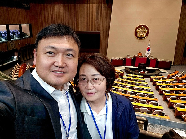 오 반장과 국회 본회의장에서 기념 컷. 동료 학생들은 열정 넘치고, 의지 다분한 모습에 3년 내내 어머니를 ‘반장’에 앉혔다. 이만하면 ‘장기독재’다. aka ‘오 반장’은 반장의 권한을 이용해 수학여행 겸 졸업여행을 국회로 정했다. 기자 아들이 10년 가까이 출입하는 곳이라고 열심히 자랑했으리라. 나는 자의 반, 타의 반 주말에 오 반장과 평균 연령 70대인 반원 20여 명과 졸업여행을 동행했다. 말이 동행이지 ‘일일 가이드’와 '찍사' 노릇을 하라는 무언의 압력이 뒤따랐다. 오전 8시, 학교 정문에서 단체 사진을 박아 찍어 드리고 출발했다. 셔틀버스가 출발하기 전 신분증 검사를 했다. 이럴 땐 어디서나 꼭 한명씩 있다는 분이 나오기 마련. 한 분이 신분증을 차에 두고 오셨단다. 버스 출발 전이라, 얼른 가져오라고 한 뒤 기다렸다. 그나마 집에 두고 온 게 아니니 얼마나 다행인가.
