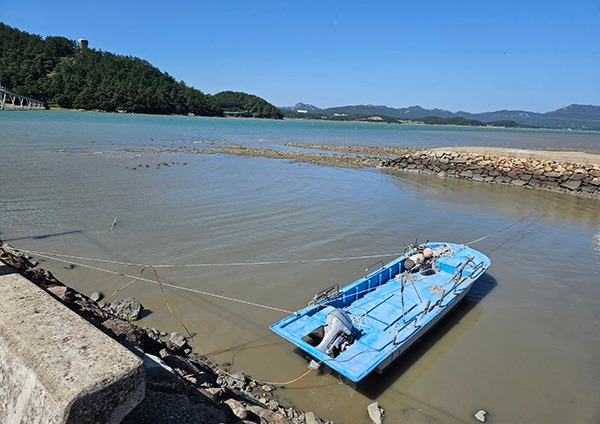물빠진 강진만에 소형 선박 한 척이 휑뎅그렁하니 정박해 있었다.