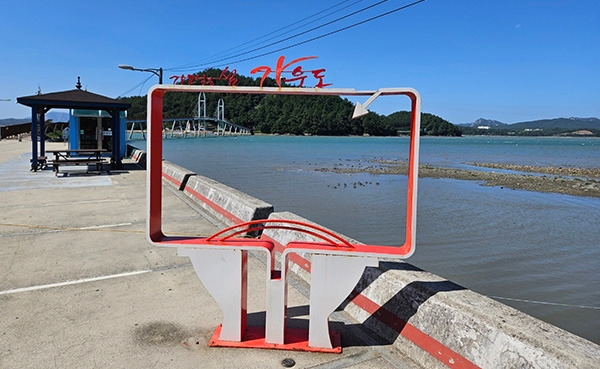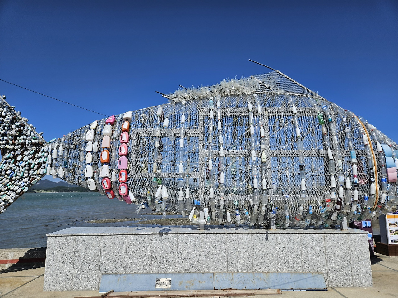 커다란 텔레비전 모양에 ‘가고 싶은 섬 가우도’라는 글귀가 붙은 포토존이 맨 먼저 보였다. 그 앞에는 물 빠진 강진만에 소형 선박 한 척이 휑뎅그렁하니 정박해 있었다. 그 뒤로는 대형 물고기 모양의 조형물이 있었는데, 빈 막걸리 통이 주렁주렁 매달려 있어 구미를 당겼다.