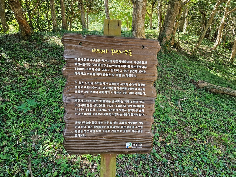 백련사는 천연기념물(151호)로 지정된 동백나무 숲이 유명하다. 강진 여행에서 첫 손을 꼽자면 백련사 동백나무 숲이라고 해도 과언이 아닐 만큼. 백련사 사적비에도 ‘아름다운 숲’이라고 기록할 만큼, 아름다운 곳이다. 누가 심었는지 모를 동백나무가 절 입구와 일주문부터 죽 이어졌다. 동백나무는 약 1,500그루 동백나무가 있는데, 높이는 대략 6~7m쯤 되고, 가장 오래된 나무 수령은 수백 년은 족히 되는 듯했다.