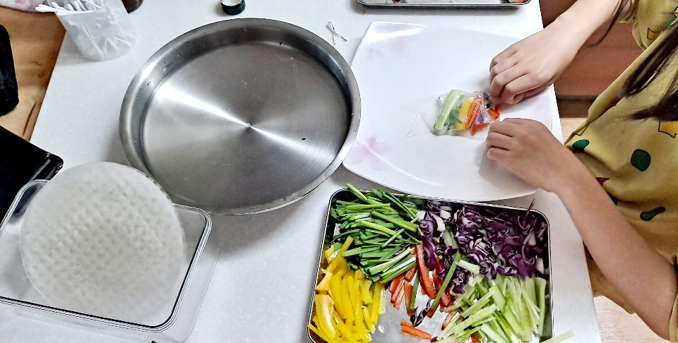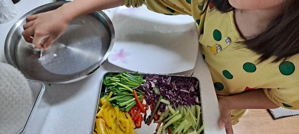 제가 만든 첫 번째 월남쌈을 본 딸이 혀를 차며 말했습니다. “일단 안에 물기가 너무 많아. 그리고 라이스페이퍼를 쌀 때 재료가 움직이지 않게 고정해야 예쁘게 말린다고요.”