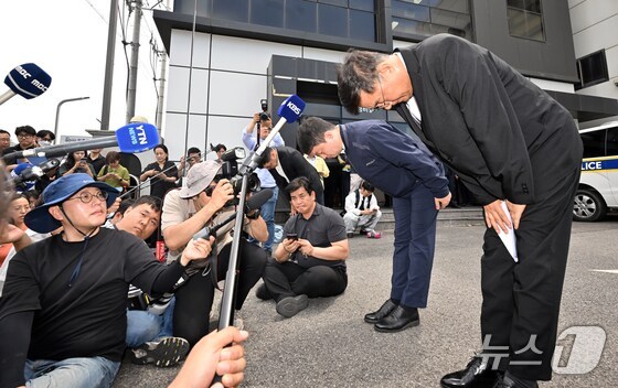 박순관 에스코넥 대표가 25일 오후 경기 화성시 '아리셀' 공장 화재 현장에서 화재 사고 발생에 대해 고개 숙여 사과하고 있다. 출처: 뉴스1