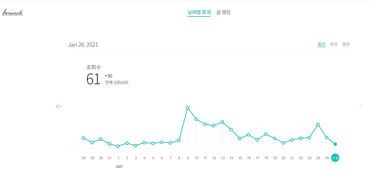 브런치 누적 조회수가 10만을 돌파했습니다. 지난해 8월 28일 첫 글을 올린 지 5개월, 정확히 150일 만입니다. 시작할 때만 해도 이 짧은 시간에 조회수 10만을 넘으리라곤 상상조차 못 했습니다. 그저 매일 쓰려고 노력했고, 적어도 이삼일에 한 번은 써야겠다는 일념으로 글을 끄적였습니다.