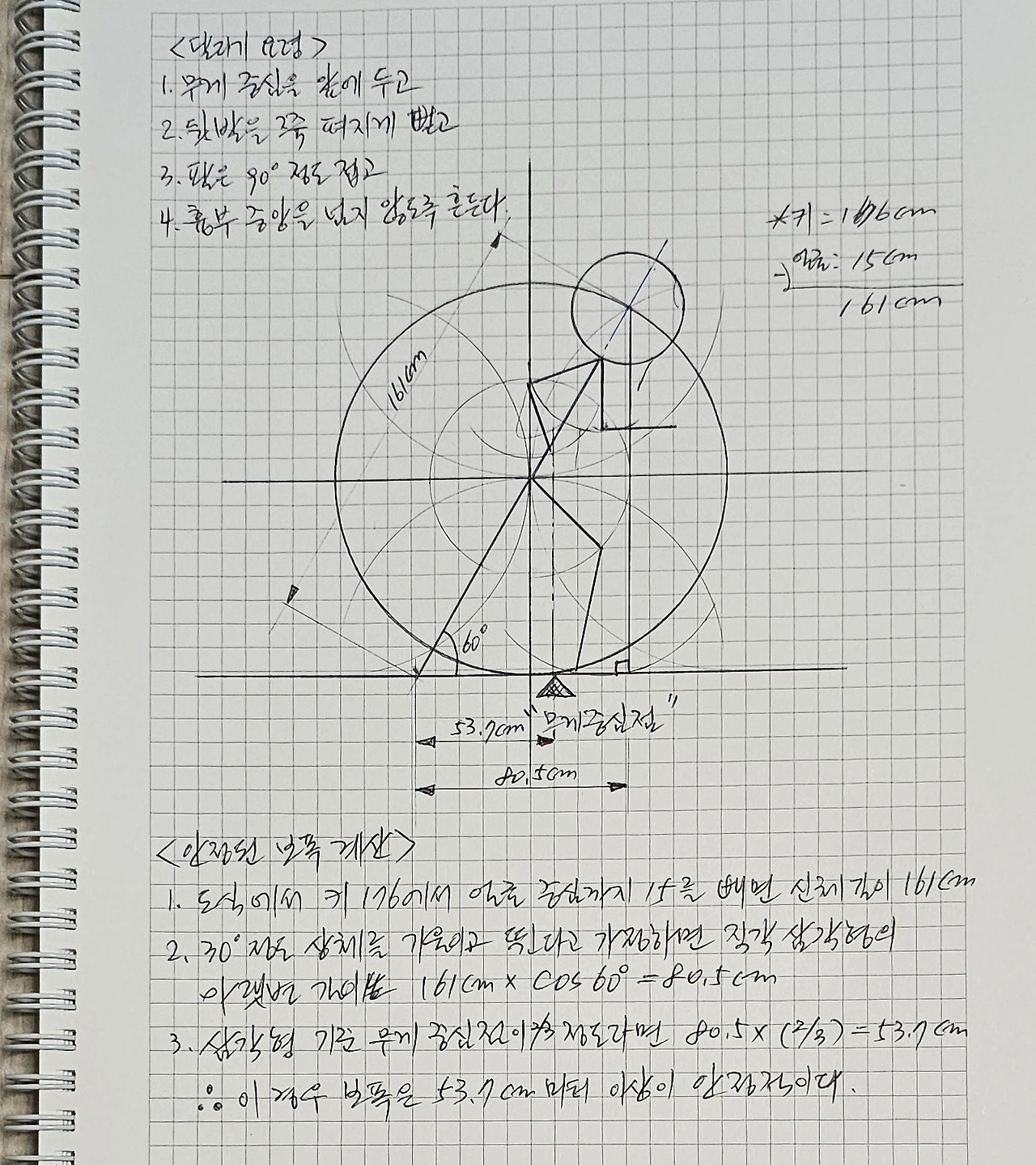 페이스를 찾느라 속도를 늦췄다 빨리했다 바꿔보면서 상체를 어느 정도 기울이고, 발을 딛는다는 생각보다는 무릎을 들어준다는 생각으로 하면 저절로 일정 보폭이 나오며 속도를 유지할 수 있다는 걸 알았다. 그렇다면 어느 정도 기울이면 좋고 어느 정도 보폭이면 안정될까 궁금해서 도식화해 보기로 했고, 달리기 끝내고 정리해 보니 그림과 같다.
