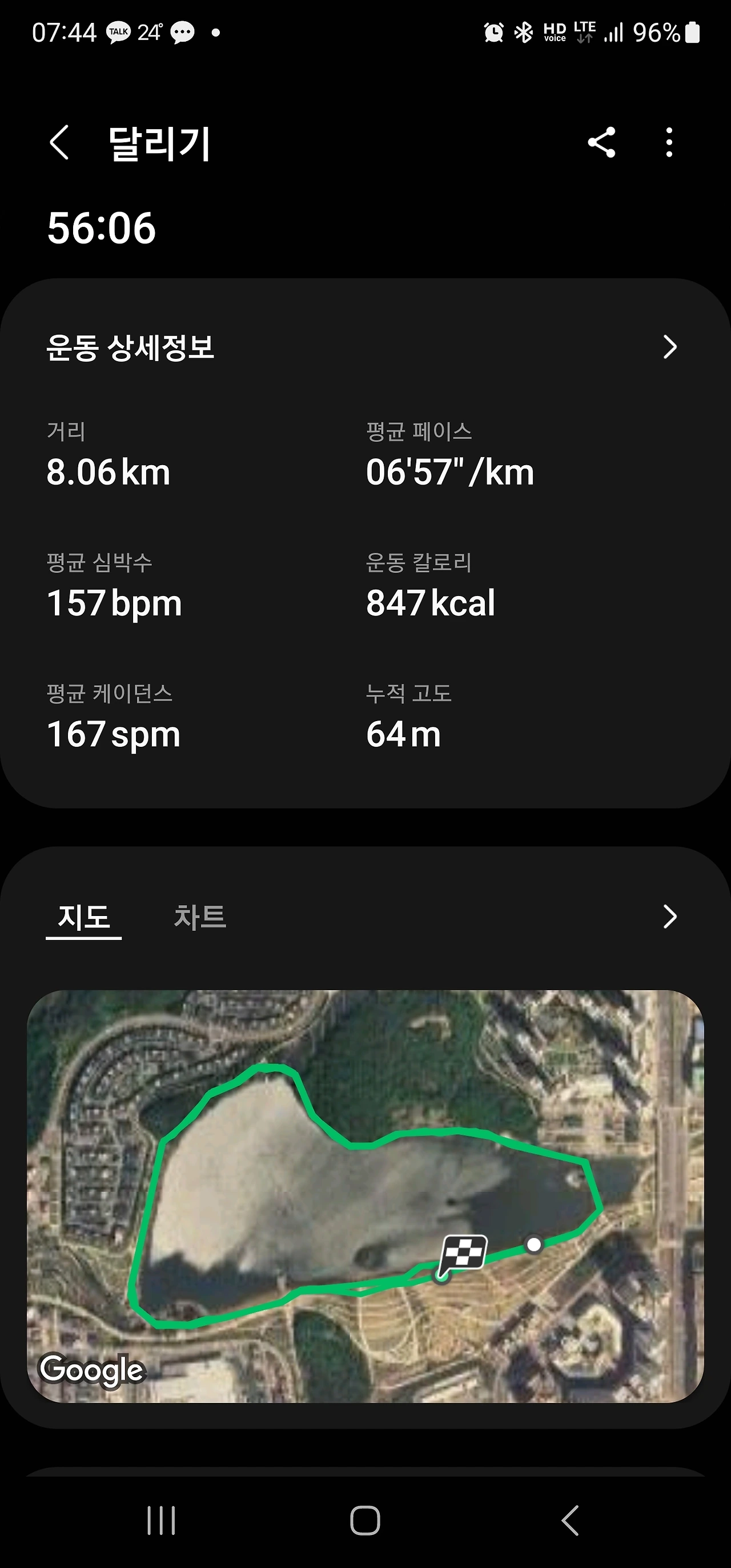 뜀박질하는 인문학자가 되려나? 생각하며 8킬로미터를 완주하고, 숨 고르기와 함께 여태껏 생각들을 갈무리한다. 목표 8킬로미터를 평균페이스 6분 57초에 뛰었다. 지난번 7킬로미터를 뛸 때는 7분 2초였으니까 5초 향상되어 목표 달성이다. 평균심박수가 지난번 177 bpm이었는데 이번에는 157 bpm인걸 보니 체력도 좋아진 거 같다. 달리는 기술 측면에서도 힘들다고 자세를 세우면 속도가 엄청 감소하는 걸 알았다. 그래서 참고 꾸준히 앞으로 기울인 자세를 유지하고, 발바닥을 땅에 최대한 오래 딛고, 박차고 오르듯이 앞으로 밀면 속도, 보폭을 유지하는데 도움이 된다. 생각과 체력강화의 일거양득 효과가 있는 달리기를 꾸준히 해서 숨을 헐떡이며 뛰는 노인이 되자!